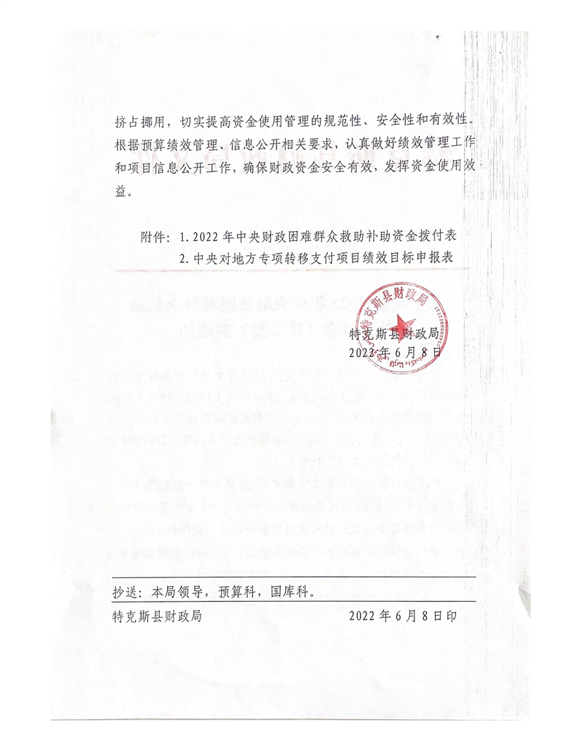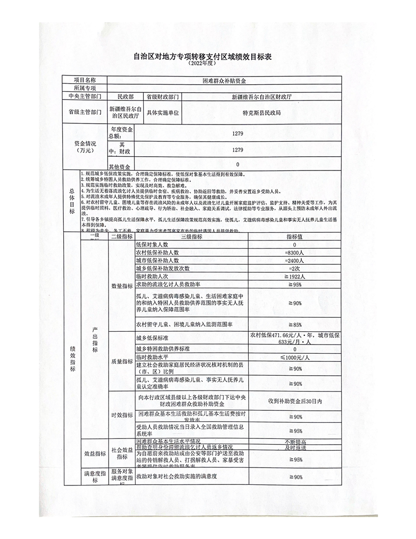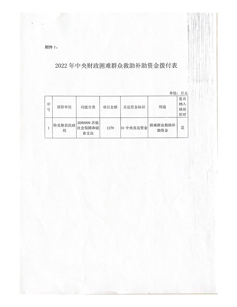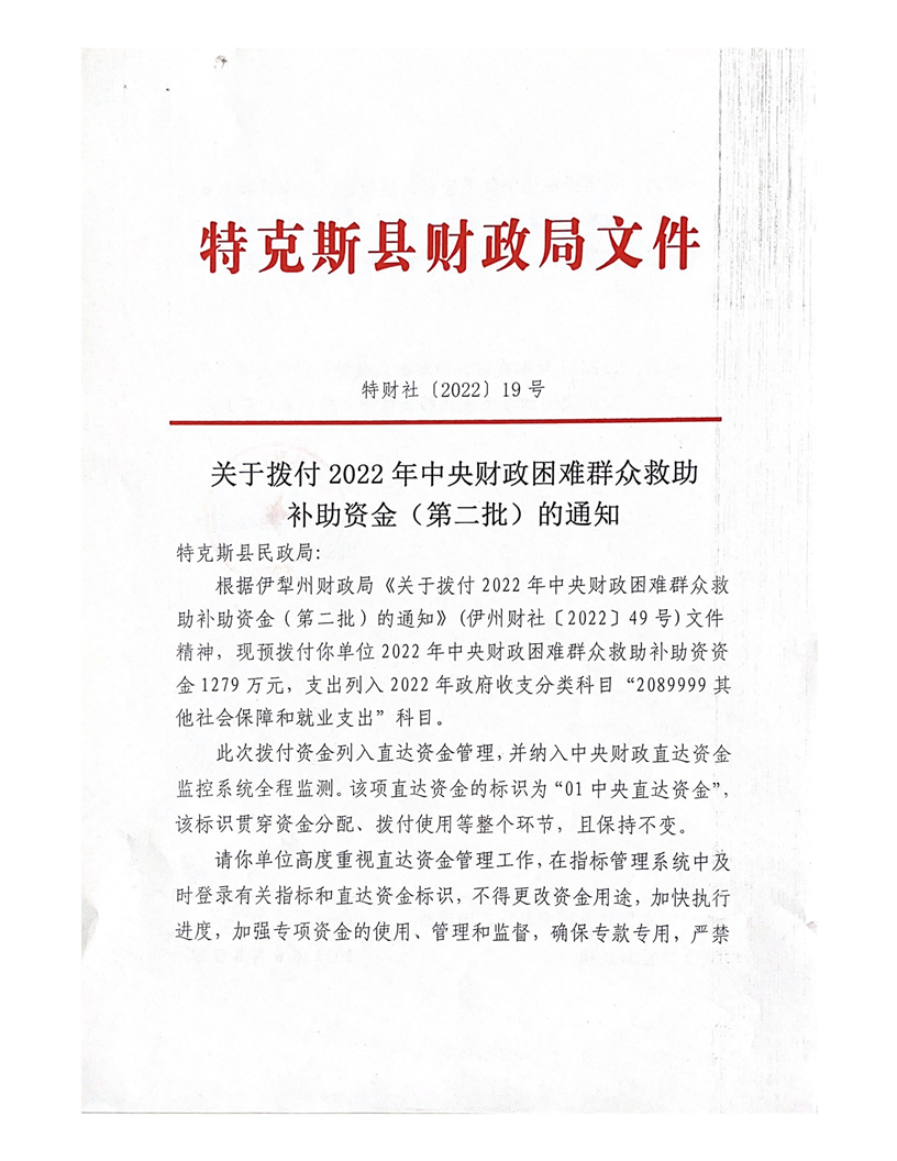 特财社【2022】19号 关于拨付2022年中央财政困难群众救助补助资金(第二批)的通知(1279万元)
