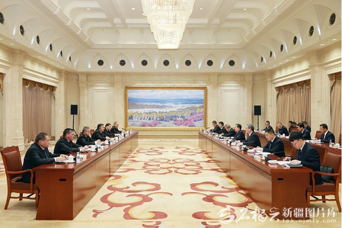 1月14日,自治区党委书记陈小江、自治区主席艾尔肯·吐尼亚孜在乌鲁木齐会见土库曼斯坦副总理阿塔哈雷耶夫。石榴云/新疆日报记者 崔志坚摄