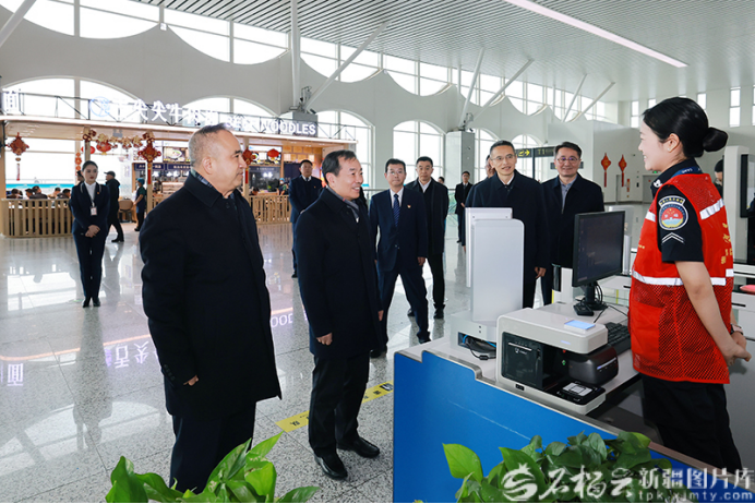 2月13日,自治区党委书记陈小江、自治区主席艾尔肯·吐尼亚孜在喀什徕宁国际机场,亲切看望春运一线职工。石榴云/新疆日报记者 崔志坚摄