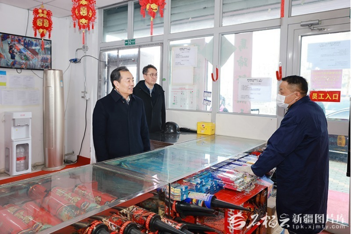 2月20日,自治区党委书记陈小江在乌鲁木齐高新区(新市区)一处烟花爆竹直营店,向经营人员致以新春祝福,详细了解烟花爆竹产品来源、销售和安全防范措施落实等情况。石榴云/新疆日报记者 崔志坚摄