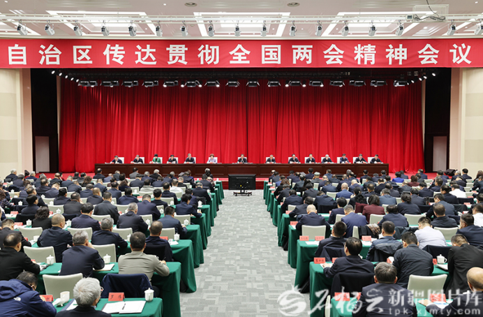 3月14日,自治区传达贯彻全国两会精神会议召开。自治区党委书记陈小江主持会议并讲话。石榴云/新疆日报记者 崔志坚摄
